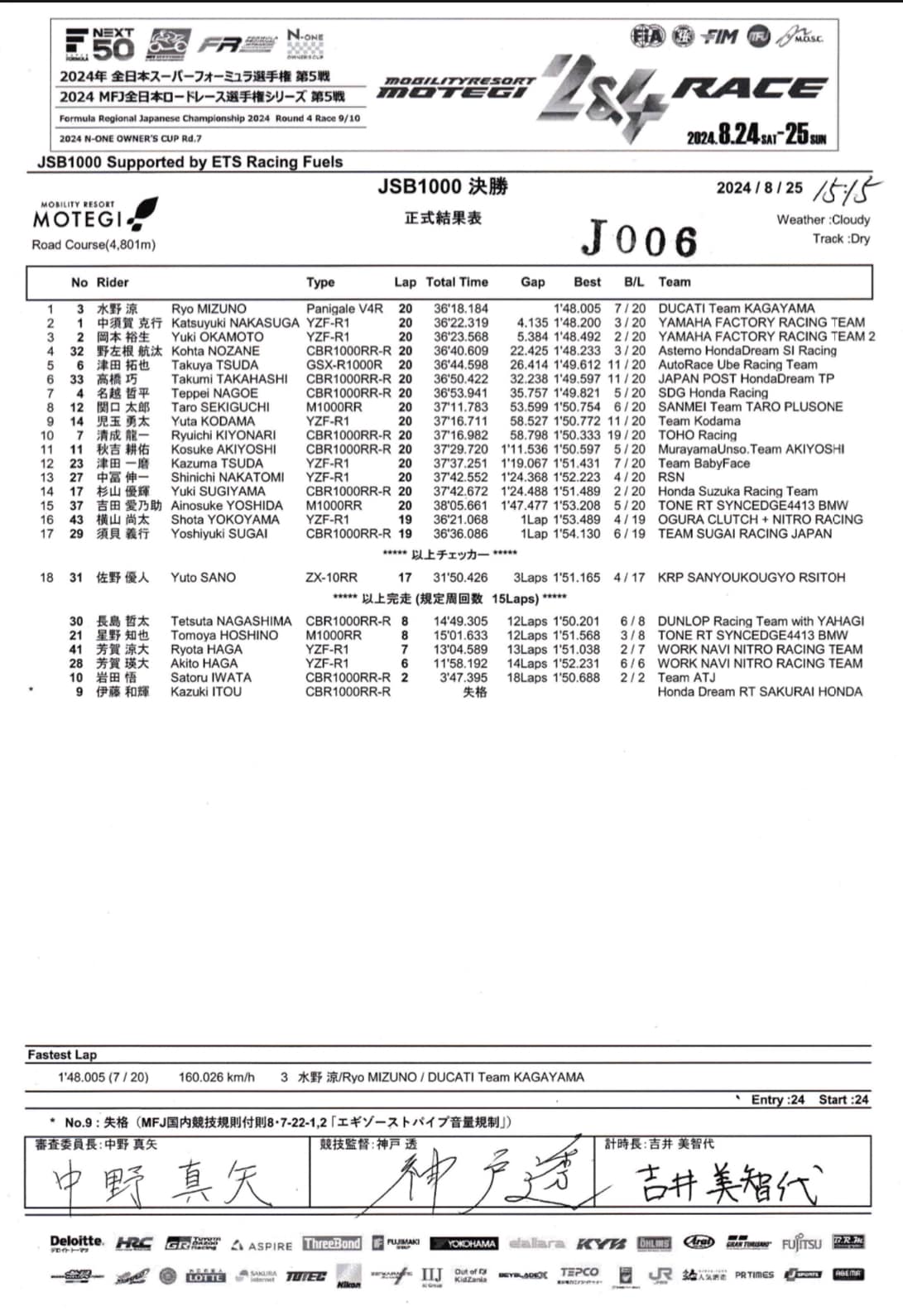 2024年8月25日、2024 MFJ全日本ロードレース選手権シリーズ第5戦 もてぎ2&4レース JSB1000クラスの決勝レースが開催されました。
